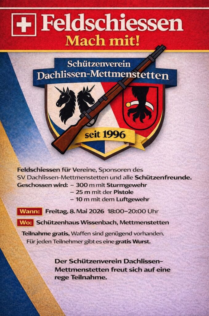 Gäste bitte mindestens 2 Tage vor Besuch hier anmelden! Bitte beachtet, dass der Gastbeitrag neu CHF 50.00 beträgt. - Feldschiessen: Der PSV Mettmenstetten führt dieses Jahr das Feldschiessen 25m (50m wird nicht angeboten) im Bezirk Affoltern an folgenden Tagen und Zeiten durch: